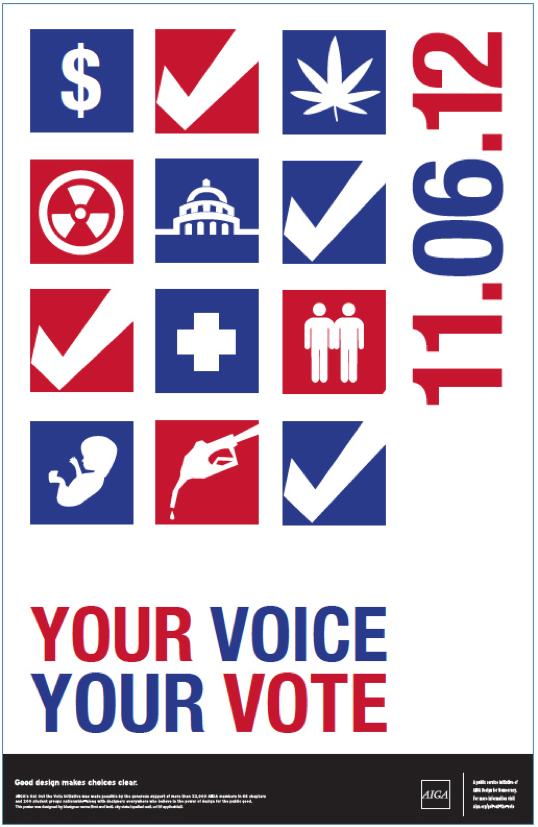 AIGA Poster Promotion encouraging voters of all ages to participate in the 2013 Presidential Election. Designed with Illustrator & InDesign. 2012.